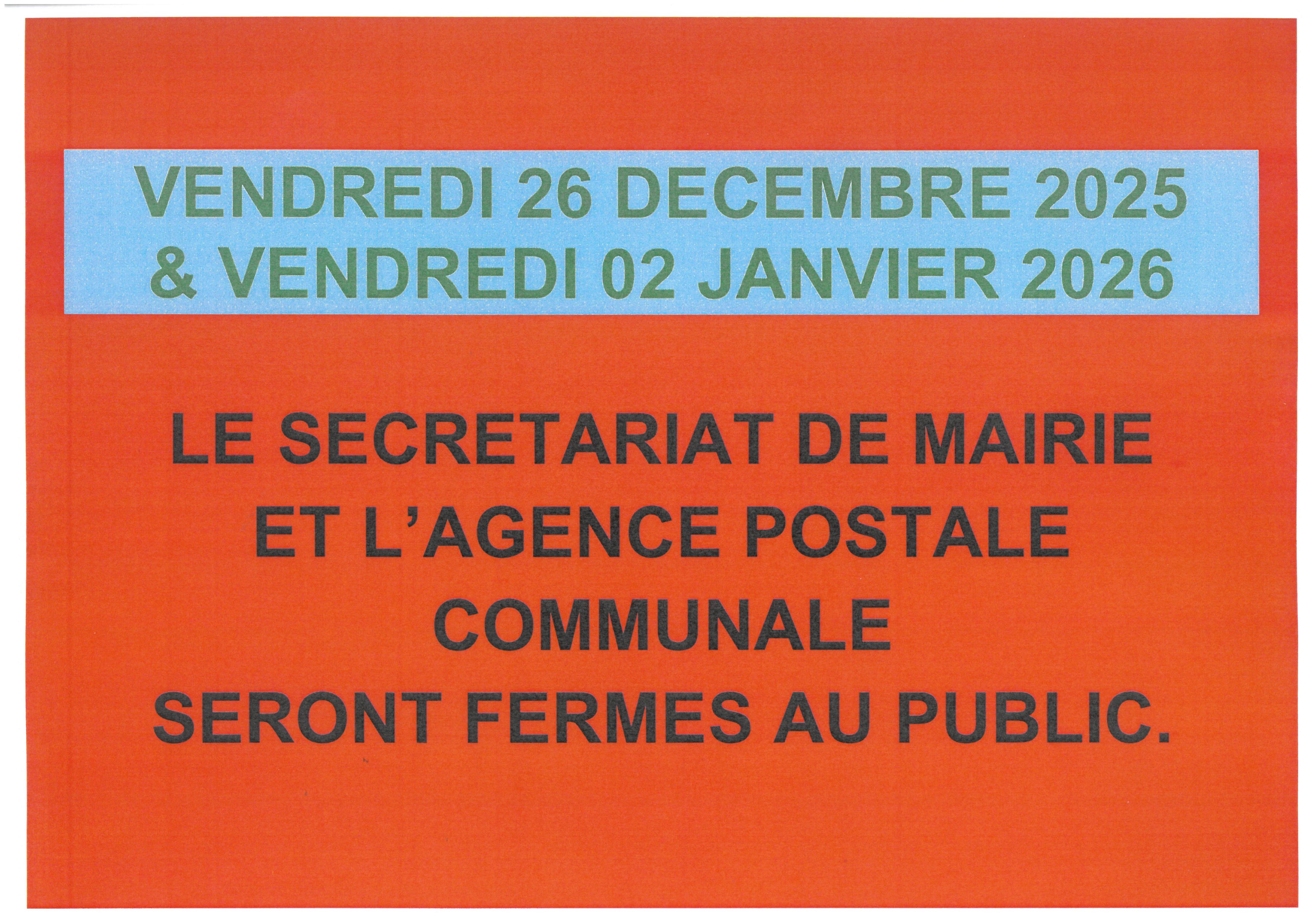 Le secrétariat de la mairie et l'Agence Postale Communale seront fermés au public les vendredis 26 décembre et 2 janvier.