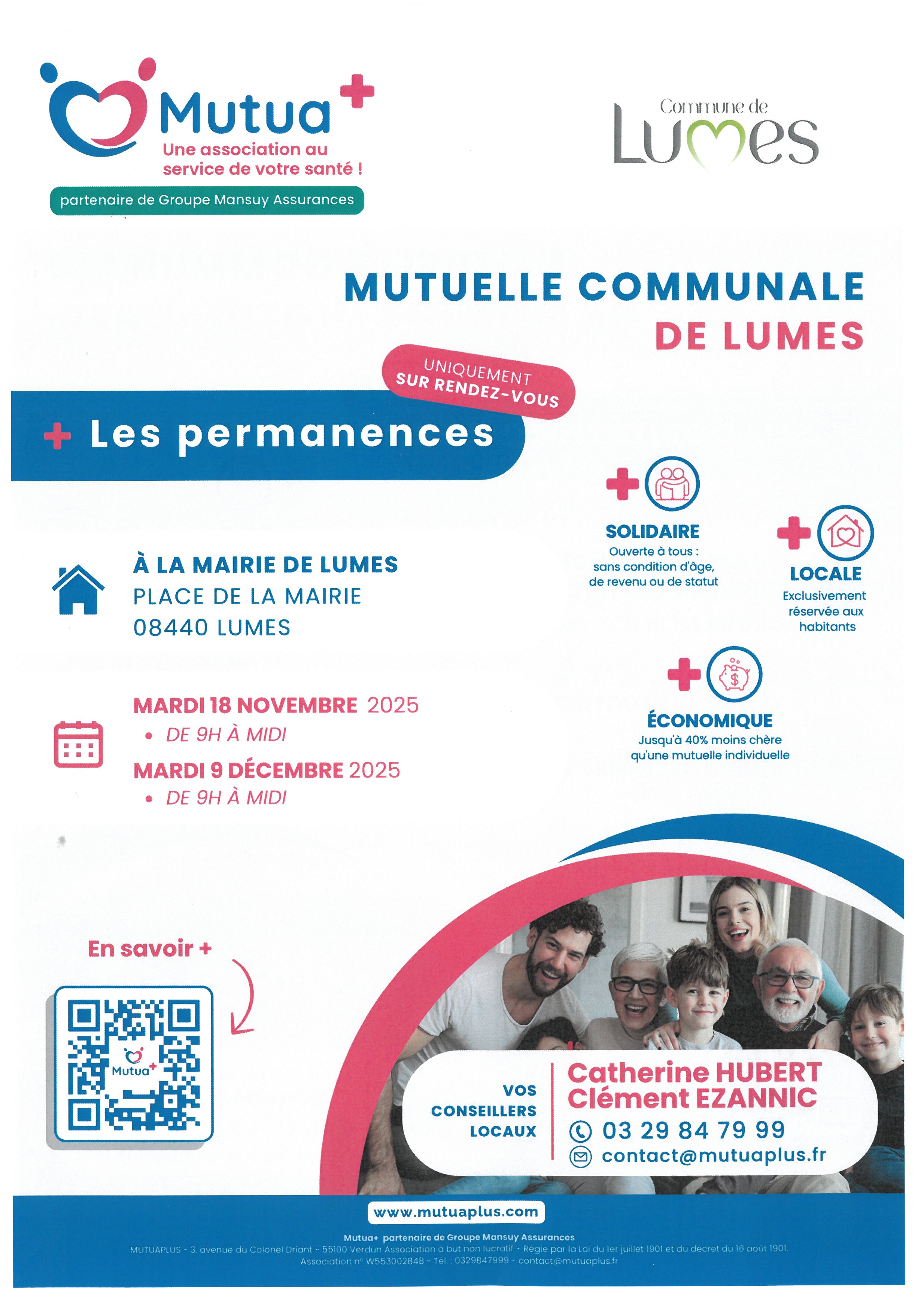 La commune de Lumes a signé une convention de partenariat avec l'Association MUTUA+ qui propose des contrats de santé de groupe à des tarifs attractifs.